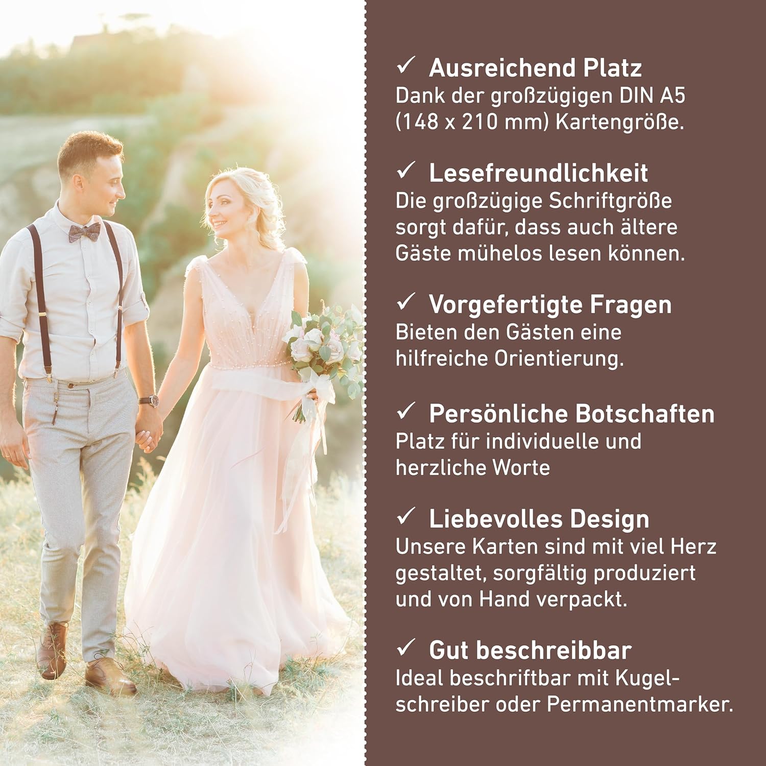 - Vorgefertigte Fragen bieten den Gästen eine hilfreiche Orientierung. Persönliche Botschaften und herzliche Worte finden ebenfalls Platz.