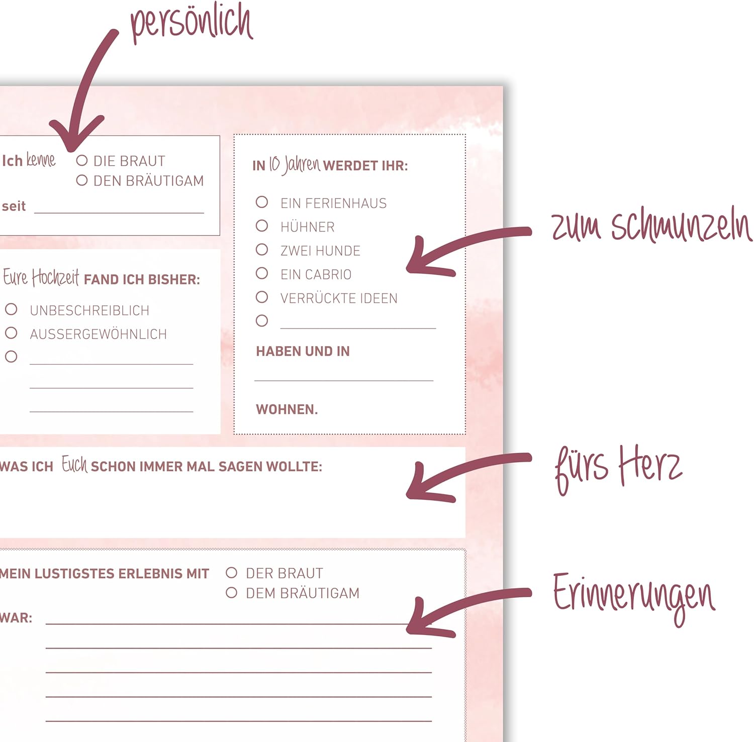 - Vorgefertigte Fragen bieten den Gästen eine hilfreiche Orientierung. Persönliche Botschaften und herzliche Worte finden ebenfalls Platz.
