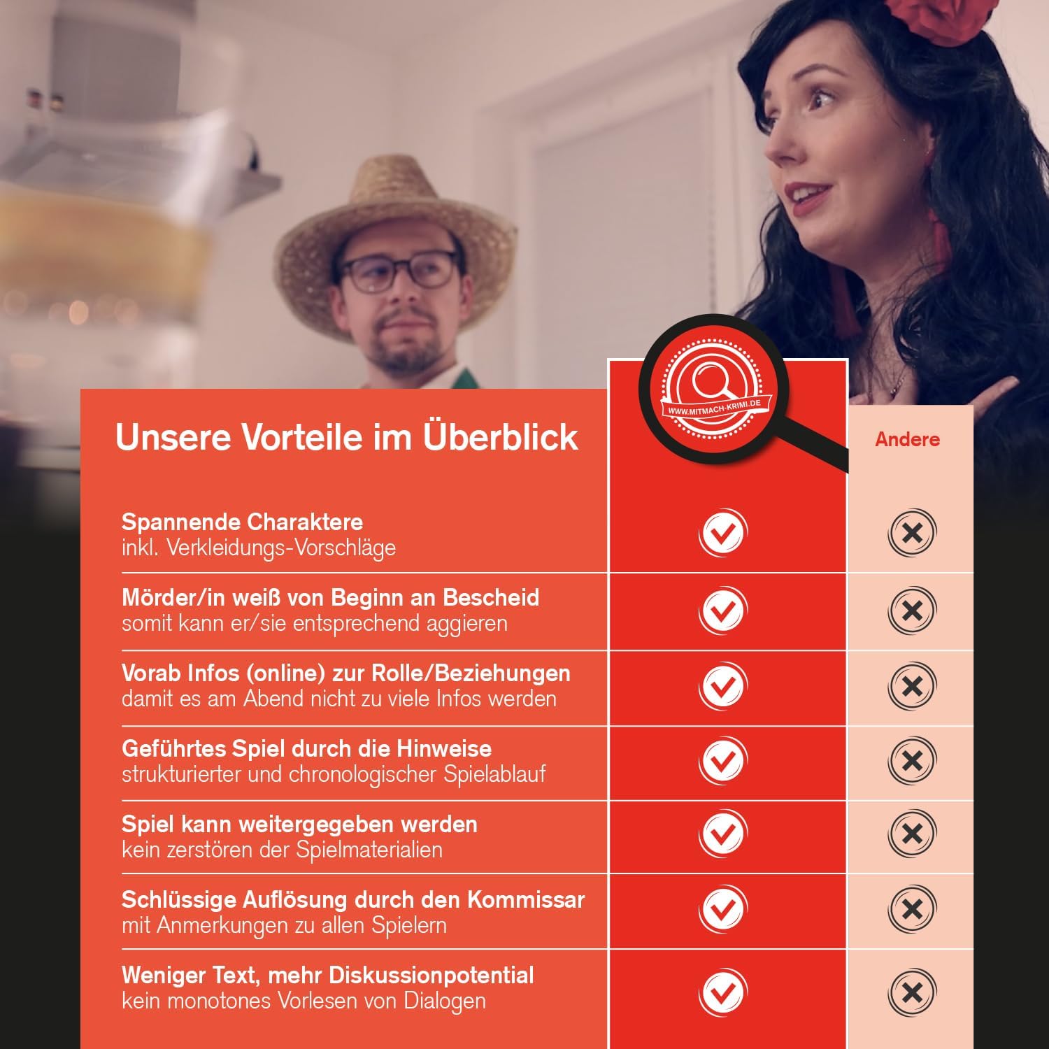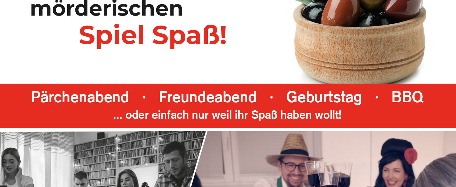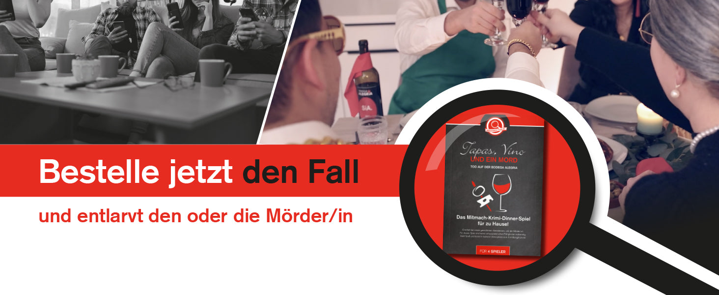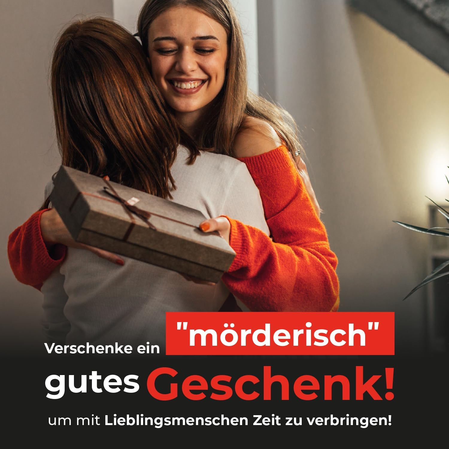 Spielt unser Mitmach-Krimi-Dinner mit Freunden – zu Hause, im Restaurant, in der Hütte oder beim Picknick. Einer von euch ist der Mörder! Findet gemeinsam heraus, wer. Ein unvergesslicher Abend voller Spannung und Rätsel erwartet euch.