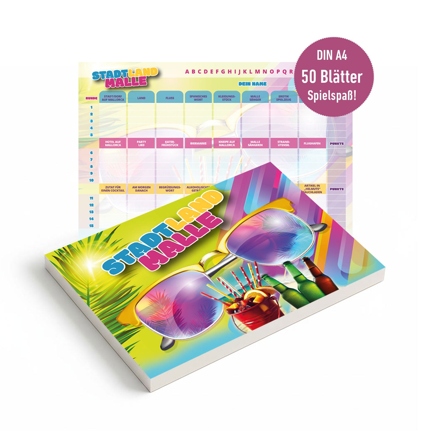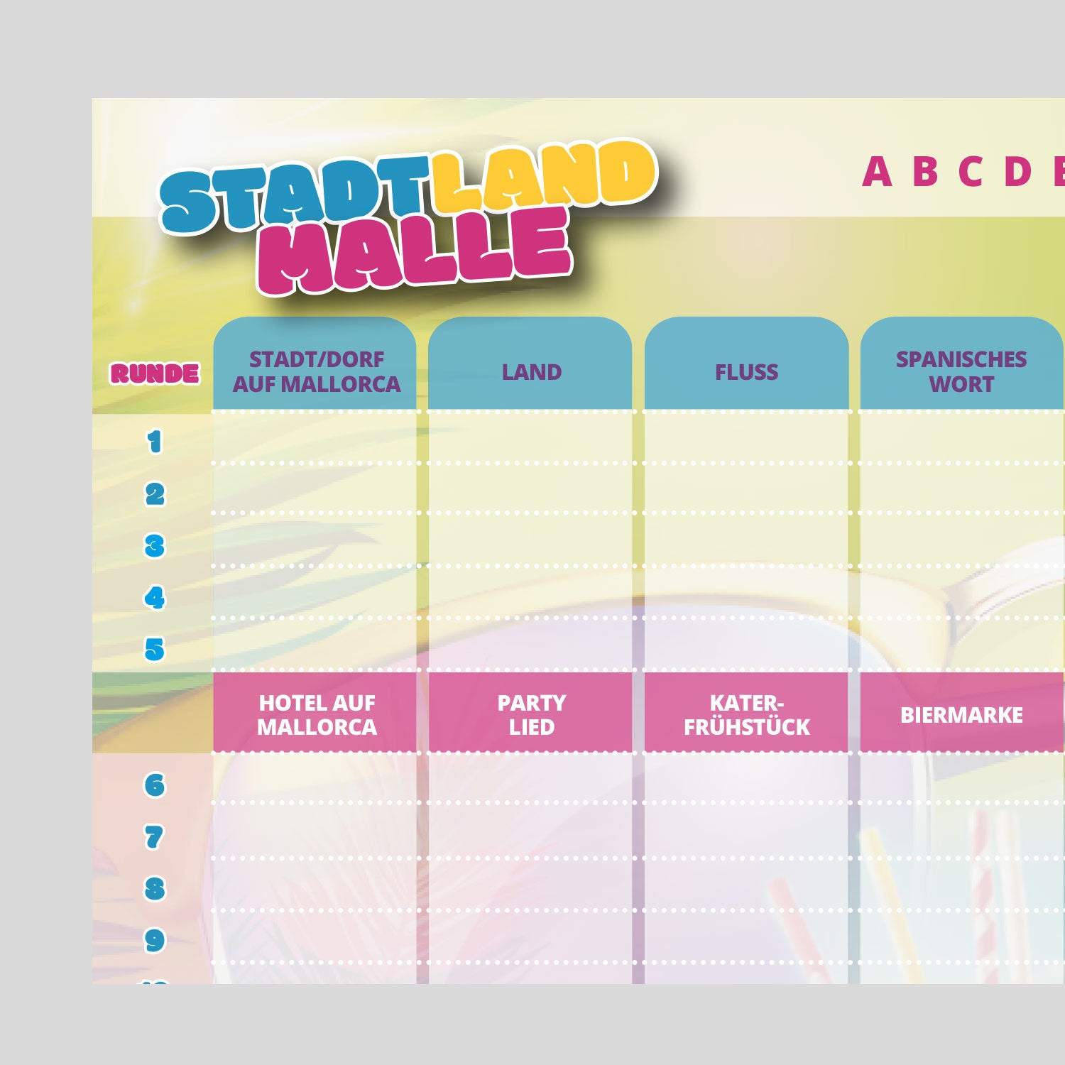 Stadt Land Malle bringt das legendäre Spielprinzip (Stadt-Land-Fluss) auf ein völlig neues Level: frech, witzig und perfekt für euren nächsten Urlaub, JGA, Sommerabend oder um Urlaubsfeeling nach Hause zu holen.